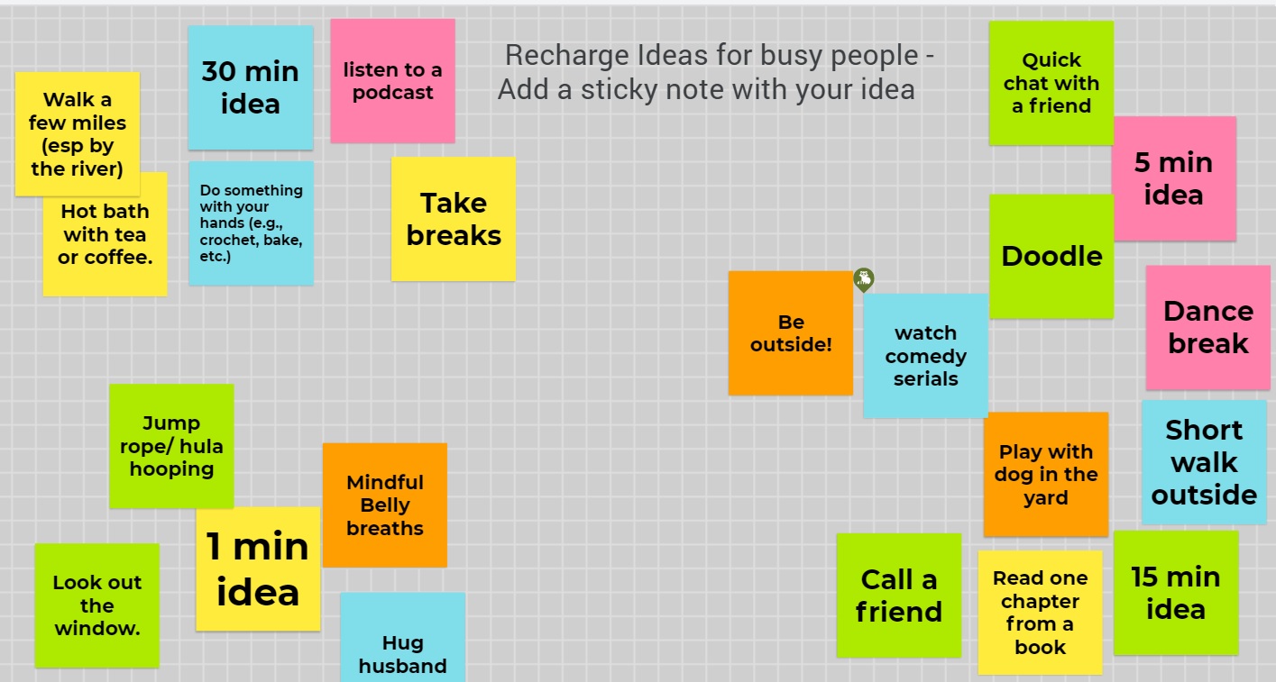 Recharge ideas for busy people – Ideas generated by my webinar participants.